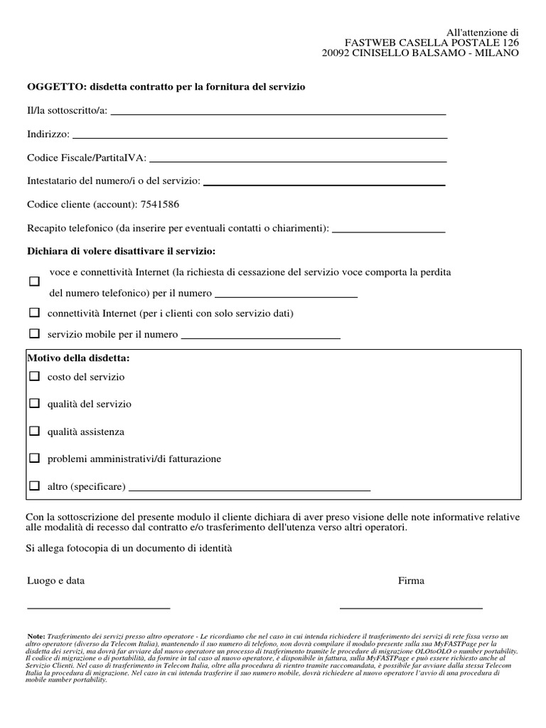 Modulo fac simile disdetta fisso TIM Impresa Semplice Servizio Clienti Business. Casella Postale 456. 00054 Fiumicino (RM). Oggetto: Recesso del contratto di abbonamento relativo ad Impresa Semplice Telecom. telecom-disdetta-contratto - Altroconsumo Di seguito le casistiche di disdetta con le varie soluzioni: 1. Abbonamento Telecom effettuato da meno di 14 giorni. In questo caso ci si può avvalere del diritto di recesso entro 14 giorni previsto dalla legge grazie al quale il contratto verrà annullato in maniera completamente gratuita. In allegato il modulo per il recesso entro 14 giorni. Disdetta Telecom Business - Salvatore Aranzulla Segui, quindi, le indicazioni della voce guida per parlare con un operatore TIM ed esplicita a quest'ultimo la tua volontà di annullare il contratto. La telefonata è gratuita. Il servizio è attivo 24 ore su 24 e 7 giorni su 7. Se hai l'esigenza di chiamare dall'estero, puoi rivolgerti sia al numero 191 che, in alternativa, al numero +39 33 44 191.